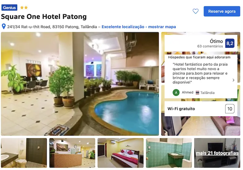 A nossa última dica de hotel bom e barato em Phuket é o Square One. É uma opção bem legal para quem procura economizar na viagem, mas ao mesmo tempo estar bem localizado (em plena Patong), com fácil acesso aos atrativos turísticos e com conforto. Conta com uma piscina ao ar livre e recepção 24h.