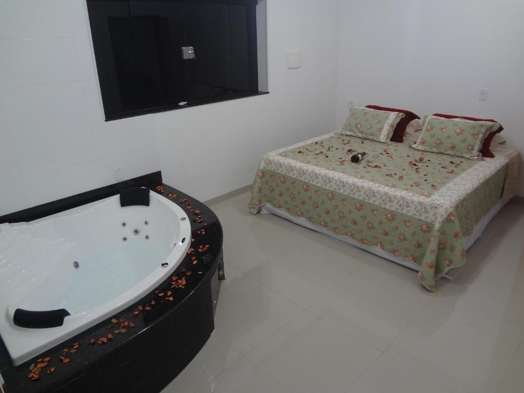 Com piscina ao ar livre e jardim, o sítio é acolhedor e tranquilo, perfeito para casais que buscam relaxar em meio a natureza. Os quartos contam com cama confortável, ar-condicionado, TV, frigobar e, em algumas unidades, banheira de hidromassagem.