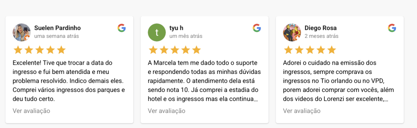 A Vou de Dicas possui 5 estrelas no Google, com nota máxima em atendimento, algo extremamente raro no mercado de turismo online. As avaliações destacam principalmente: