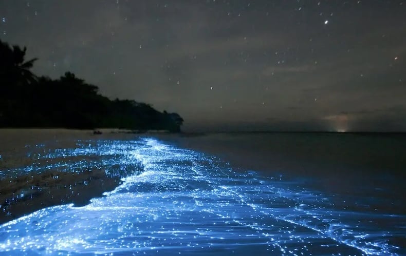 À noite, qualquer movimento na água, como nadar ou remar um caiaque, faz com que o mar brilhe e em tons intensos de azul. É algo lindo de se presenciar, afinal, a combinação de águas cristalinas e a grande concentração de dinoflagelados faz com que o espetáculo seja relativamente comum no arquipélago.