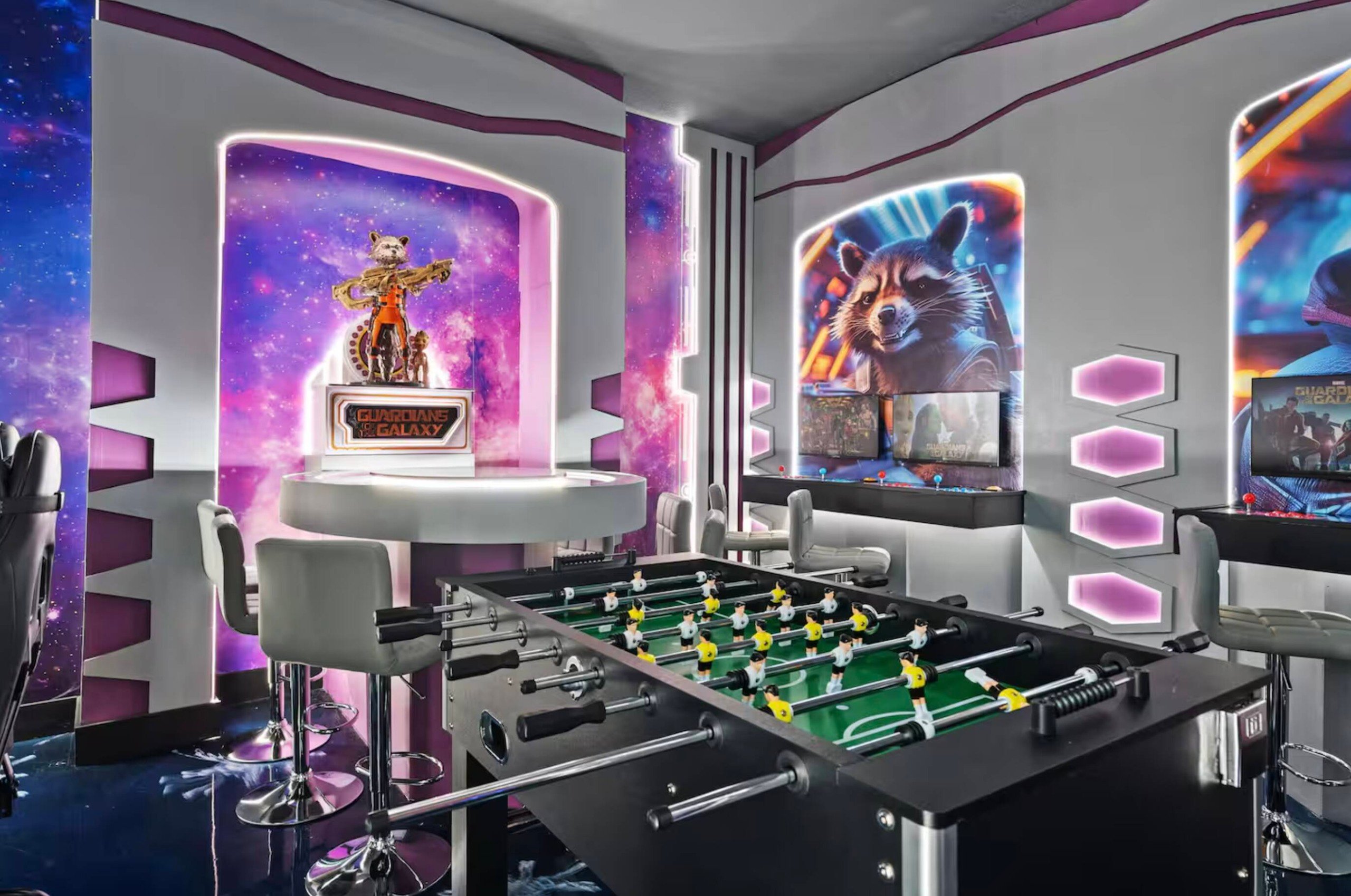 Os hóspedes aproveitam sala e quartos confortáveis, cozinha completa e uma piscina externa que te permite aproveitar bem mais sem precisar dividir com desconhecidos. Mas o grande destaque é a sala de jogos temática de Guardiões da Galáxia, que diverte tanto crianças quanto adultos.