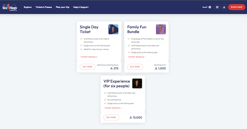 O bilhete mais básico é o Single Day Ticket, que garante acesso ilimitado a todas as atrações do parque durante um dia, com entrada única, e tem preços a partir de 275 riais sauditas por adulto.