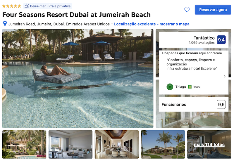 Também em Jumeirah, outra dica de hotel luxuoso é o Four Seasons Resort Dubai at Jumeirah Beach. Para quem quiser uma hospedagem à beira-mar, esta é uma das mais sofisticadas. Com praia privativa, três piscinas, spa completo, academia moderna e restaurantes premiados, este hotel é uma ótima escolha. Além disso, a localização é ótima, permitindo fácil acesso ao centro da cidade e aos principais pontos turísticos.