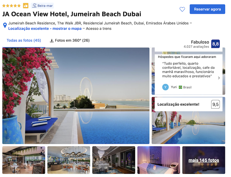 Como se percebe pelas dicas anteriores, a região de Jumeirah Beach é uma das mais luxuosas. Por isso, a sétima dica de hospedagem de luxo em Dubai é novamente nessa região: o JA Ocean View Hotel. Fica de frente para o mar e oferece piscina ao ar livre, spa, academia e acesso fácil à praia pública. A localização é ótima, estando também cercado de restaurantes, lojas e opções de lazer.