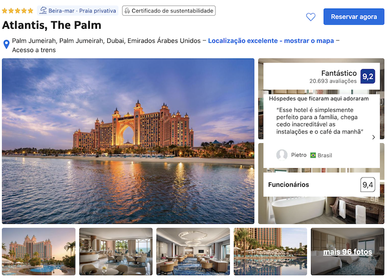 Em seguida, outra recomendação incrível para quem quer se hospedar num hotel de luxo em Dubai é o Atlantis, The Palm. Trata-se de um dos resorts mais famosos da Palm Jumeirah, uma ótima região para se hospedar, e ideal para quem busca conforto e entretenimento completo.