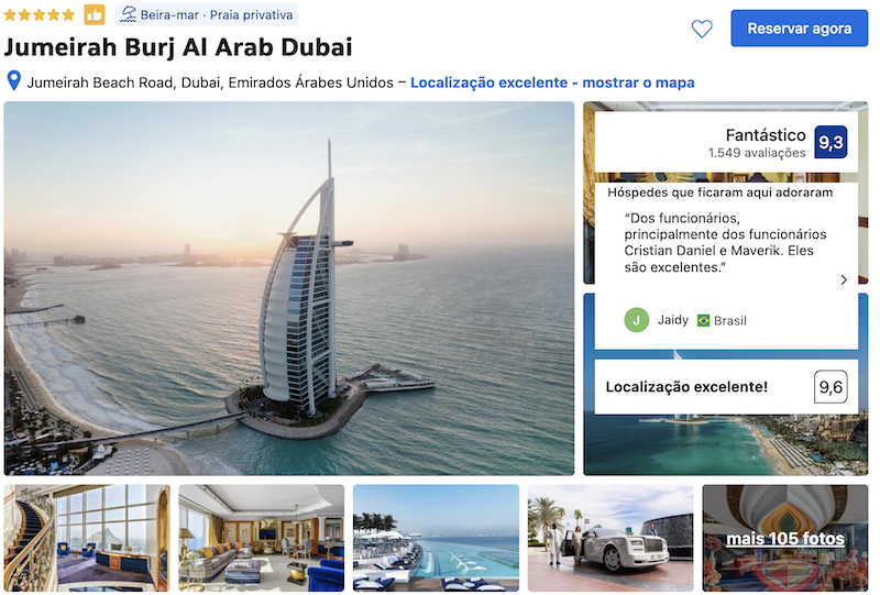 Em primeiro lugar da lista de hotéis luxuosos em Dubai, destacamos o Burj Al Arab Jumeirah, de 5 estrelas. Além de luxuoso, é sem dúvida o hotel mais icônico de Dubai, conhecido por sua arquitetura em formato de vela e localização em uma ilha artificial.