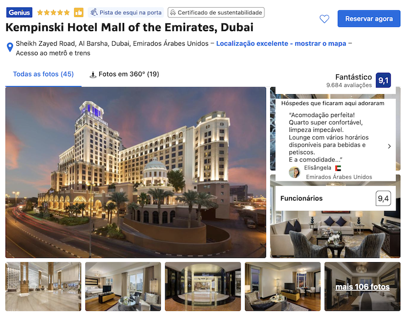 O hotel Kempinski Mall of the Emirates é outro hotel cinco estrelas que está diretamente ligado ao Mall of the Emirates, e é famoso pela pista de esqui indoor. Combina luxo, conforto e localização estratégica.