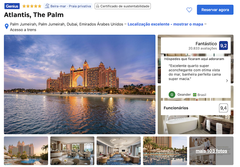 Em terceiro lugar, o Atlantis, The Palm é um dos hotéis mais conhecidos de Dubai, localizado na Palm Jumeirah. O resort oferece praia privativa, parque aquático Aquaventure, aquário, restaurantes renomados e estrutura completa para famílias!