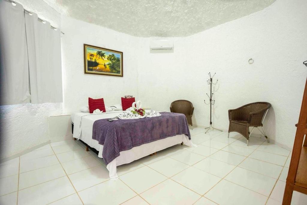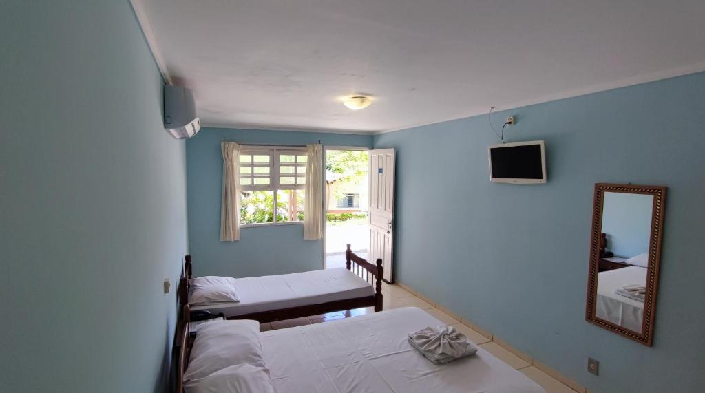Os quartos são confortáveis e trazem ar-condicionado, TV de tela plana, frigobar e banheiro privativo. E o hotel funciona em regime de pensão completa, com todas as refeições inclusas na diária.