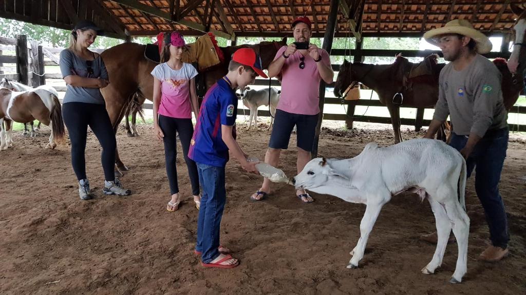 A experiência de fazenda é um dos grandes destaques do local. Durante a estadia, os hóspedes podem participar de atividades como pesca, equitação e até ordenha de vaca.