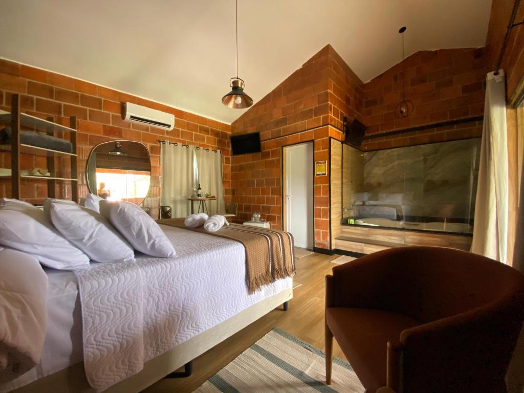 Os hóspedes podem se hospedar em uma das três casas ou dez chalés, todos aconchegantes e equipados com ar-condicionado, TV de tela plana e banheiro. O café da manhã já está incluso na diária, que começa a partir de R$ 385. O hotel tem nota 8,4.