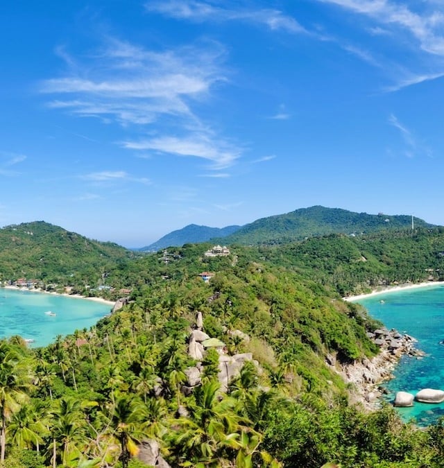 No topo do mirante, é possível ver a Shark Bay e a Chalok Baan Kao Bay, dois dos cartões-postais de Koh Tao.
