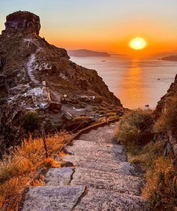 A rocha, em si, fica a 250 metros de altura — se estiver na vila de Imerovigli, a caminhada até ao pé dela dura de 15 a 20 minutos, seguida por uma trilha com escadas até o topo, que dura cerca de 30-60 minutos (e pode ser um pouquinho desafiante por ser íngrime, mas oferece vistas realmente incríveis da caldeira).