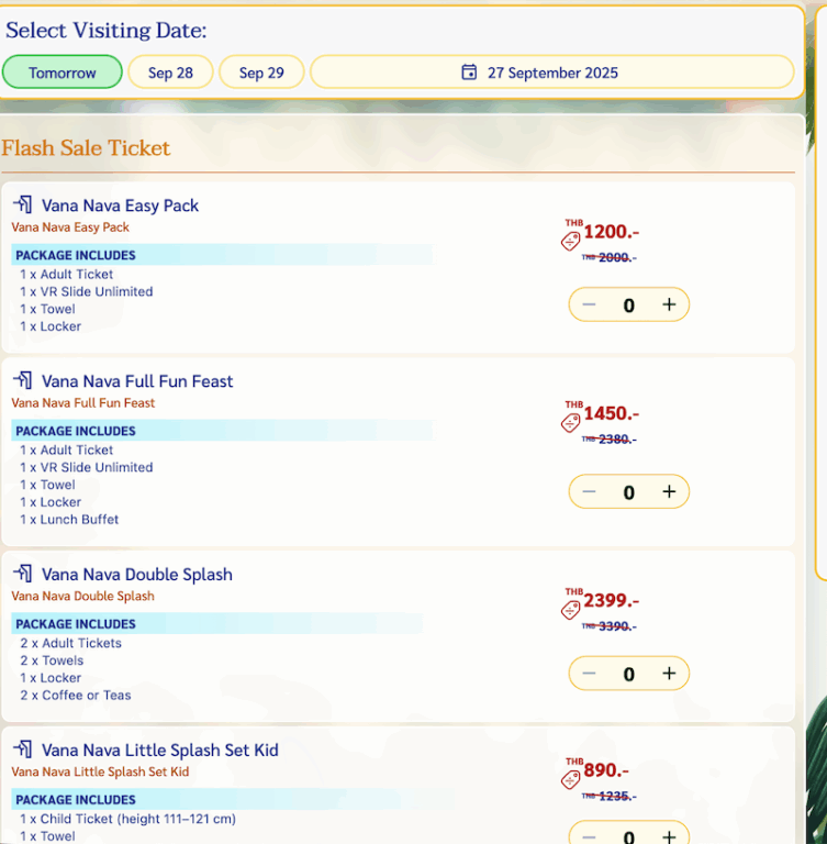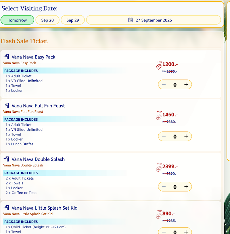 O parque aquático funciona diariamente das 11h às 16h, mas em alguns períodos de alta temporada o horário pode ser estendido, por isso confirme sempre no site oficial do Vana Nava Water Jungle. Os ingressos variam bastante de acordo com os pacotes escolhidos e pode comparar as melhores opções diretamente no site deles. MAs as crianças menores de 90 cm de altura entram gratuitamente.