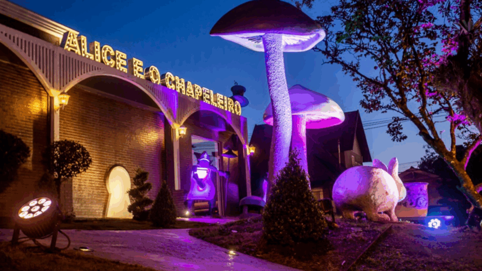 Saiba como funciona o restaurante Alice e o Chapeleiro em Gramado, um lugar que une espetáculo e jantar inspirados em Alice no País das Maravilhas.