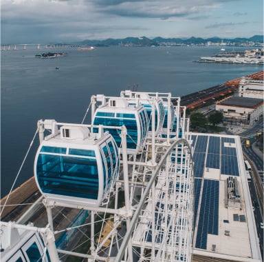 A experiência na roda-gigante de Foz do Iguaçu é tranquila e confortável. Ao invés das tradicionais cadeiras, a atração conta com cabines modernas totalmente fechadas, climatizadas e que comportam até 8 pessoas.