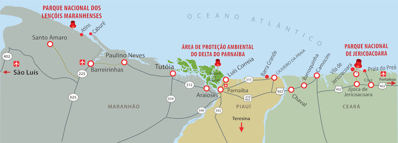 Esta rota é indicada para quem tem muita disposição física e gosta de adrenalina (como já indica o nome), já que se caracteriza pelo deslocamento constante, sendo feita em grande parte em veículos 4×4 devido aos terrenos de areia e trilhas off-road. Fora isso, é só escolher o sentido do percurso, que pode ser tanto por São Luís quanto por Fortaleza. Ao todo, são aproximadamente 500 quilômetros de rota.